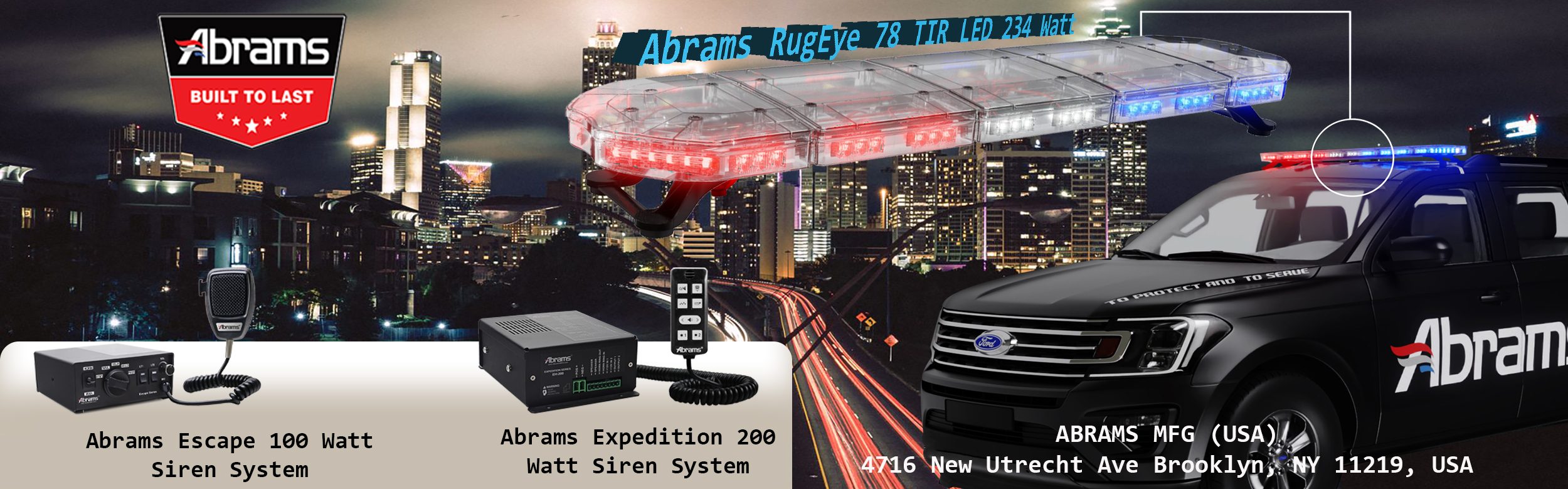 Abrams Featured Products Abrams Eco Speaker 100 Watt Lebih lanjut Abrams Escape 100 Watt Siren System Lebih lanjut Abrams Expedition 200 Watt Siren System Lebih lanjut Abrams RugEye Low Profile Lightbar Lebih lanjut Abrams Slim Speaker 100 Watt Lebih lanjut Abrams Supreme Speaker 200 Watt Lebih lanjut